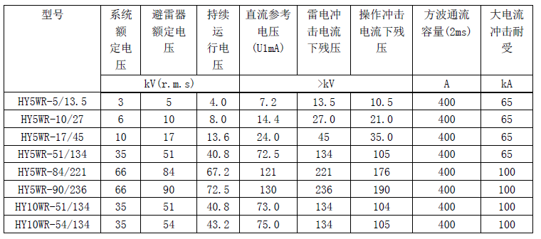 | | | | | | | |_____________________操作冲击电流下的最大残压kV