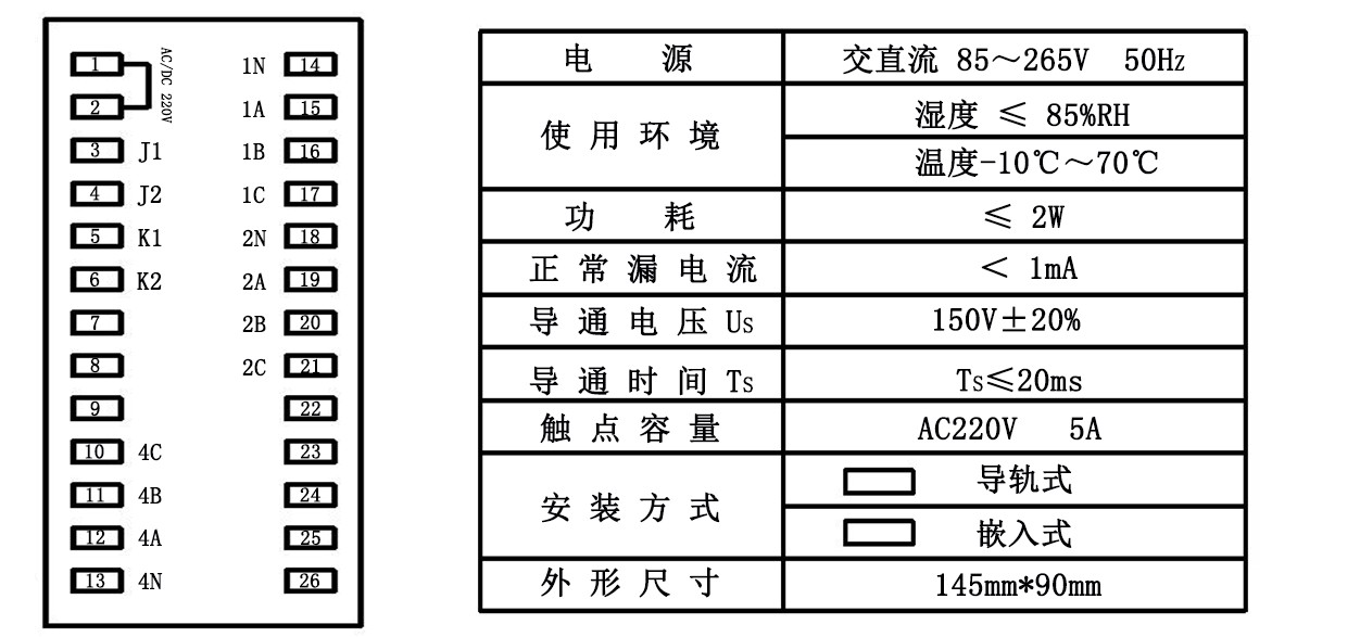 K1、K2为继电器输出接点,容量为AC:250V/5A DC:110V/2A